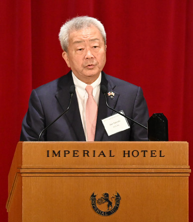 日本と米国の経営者らが、貿易・投資の将来像など両国の経済関係について幅広く議論する日米財界人会議が2日、東京都内で開幕した。写真は、あいさつする日米経済協議会の澤田純会長。 【時事通信社】