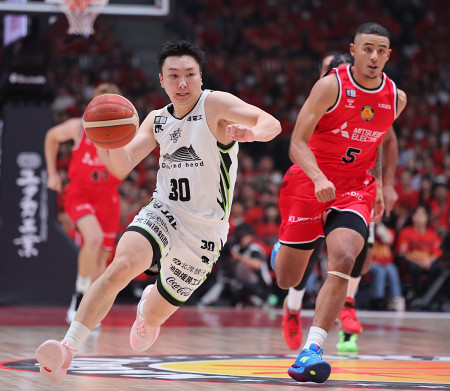 バスケットボール男子のりそなB1リーグは4日、名古屋市のIGアリーナなどで開幕節が行われ、パリ五輪代表の富永が加入した北海道は名古屋Dに56―68で敗れ、黒星スタート。写真は攻め込む富永(左)。 【時事通信社】