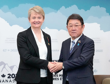 カナダを訪問した茂木敏充外相は11日、英国のクーパー、カナダのアナンド両外相と個別に会談し、安全保障や経済の分野で協力を強化していくことで一致した。写真は握手する茂木氏(右)とクーパー氏(外務省提供) 【時事通信社】