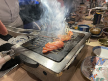 定食メニューは、一口サイズのタイ・ブリ・マグロの赤身など魚6枚と旬の野菜3種をセットにしたランチ限定の「並 うお焼き定食」(1,990円)、タイ・マグロの中トロ・ホタテ・ウナギなど7枚と焼き野菜3種をセットにした「上 うお焼き定食」(2,990円)、ウナギ7枚と焼き野菜3種をセットにした「うお焼き活鰻(かつまん)定食」(3,690円)など。定食には、サラダ・梅酢シャリ・汁物・薬味が付き、梅酢シャリと汁物はお代わり自由。丼物は、「うお焼き丼」(2,590円)や「極上 うお焼き丼」(4,890円)、「活鰻丼」(2,990円)をそろえる。