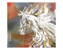 今回は、今年の干支(えと)である「午(うま)」をテーマに制作した新作約20点を含む約30点の陶墨画を展示・販売する。作品は、竜の蹄(ひづめ)が雲を翔けるように、未来へ力強く駆け抜ける馬の姿を描いたという「龍蹄翔雲」をはじめ、「風雷奔翔(ふうらいほんしょう)」(以上198万円)、「汗馳楽心(かんちがくしん)」(165万円)など。