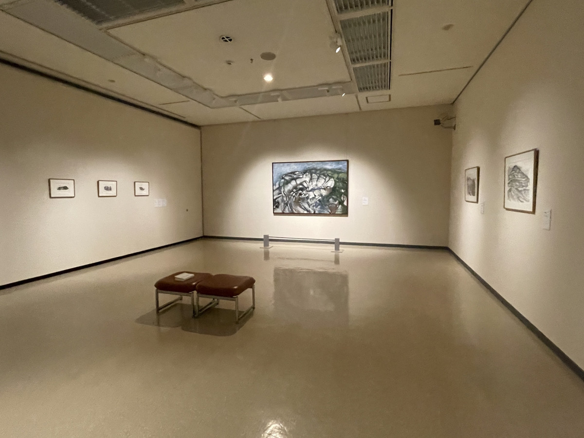 福岡県立美術館で開催中の展覧会「みんなの画材-山本文房堂の的野さんは、野見山暁治さんとともにこの街を励まし続けた」の会場の様子。序章の「産声を上げる神野山」展示の様子