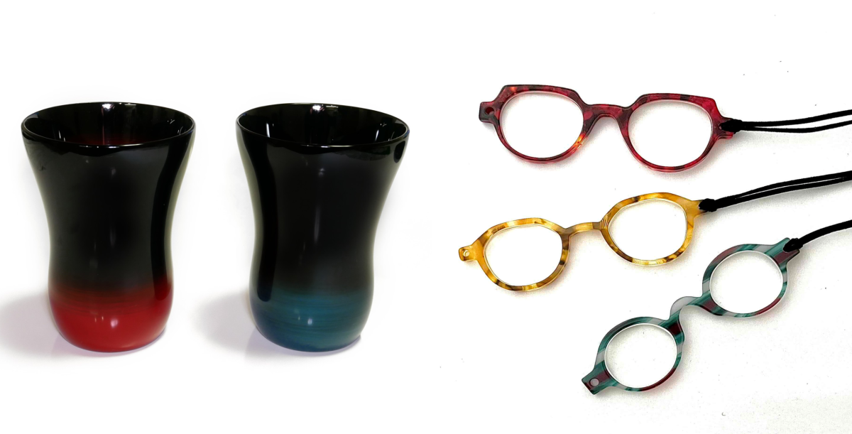 「第2回北陸展」で販売する工芸品。(左から)「坂本漆器店」の「輪島塗 フリーカップ」、「メガネ素材工房 COTON」の「ペンダントルーペ」