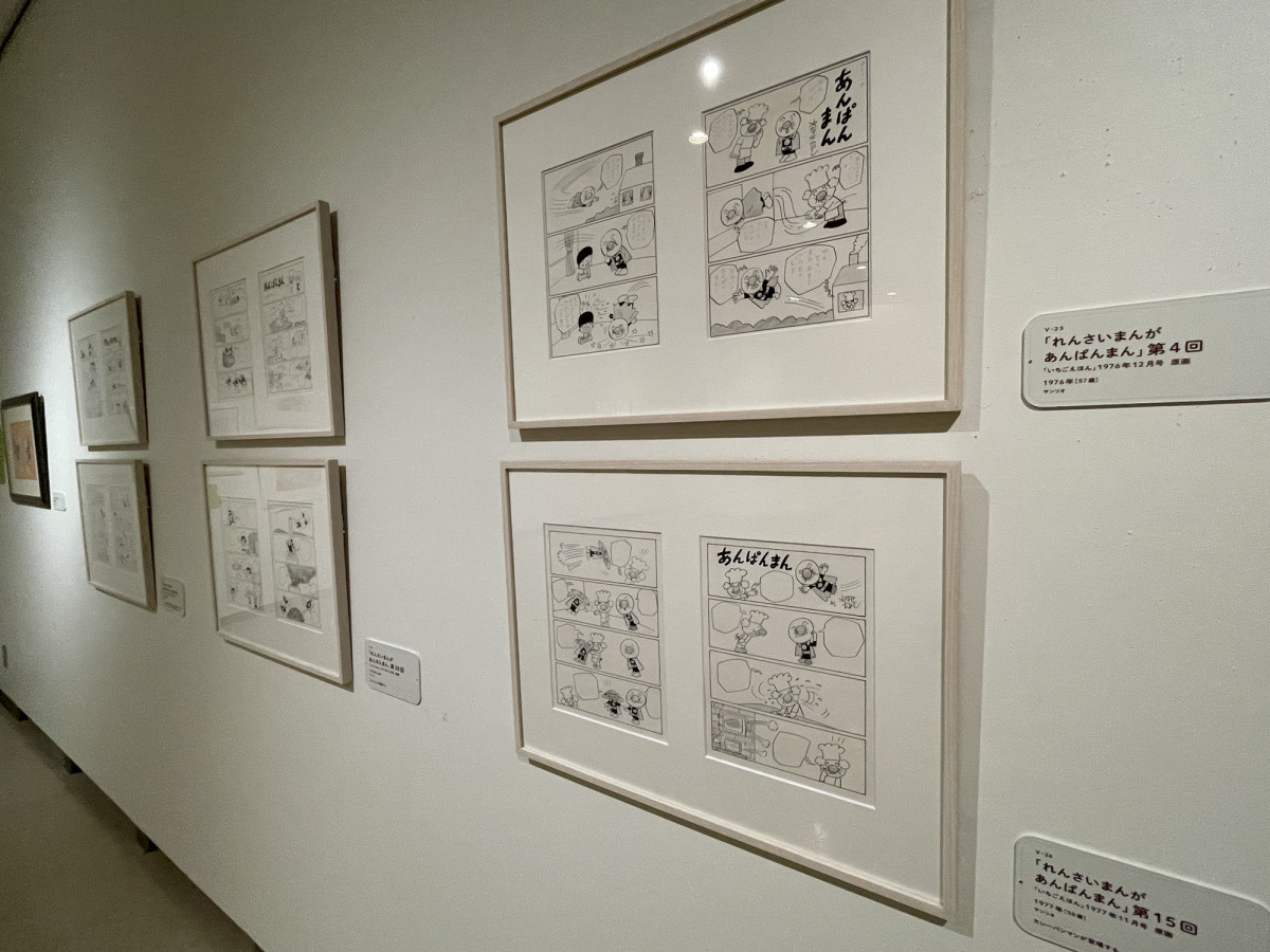 福岡県立美術館で開催中の展覧会「やなせたかし展 人生はよろこばせごっこ」の会場の様子。「れんさいまんがあんぱんまん」ほか ©やなせたかし (公財)やなせたかし記念アンパンマンミュージアム振興財団蔵