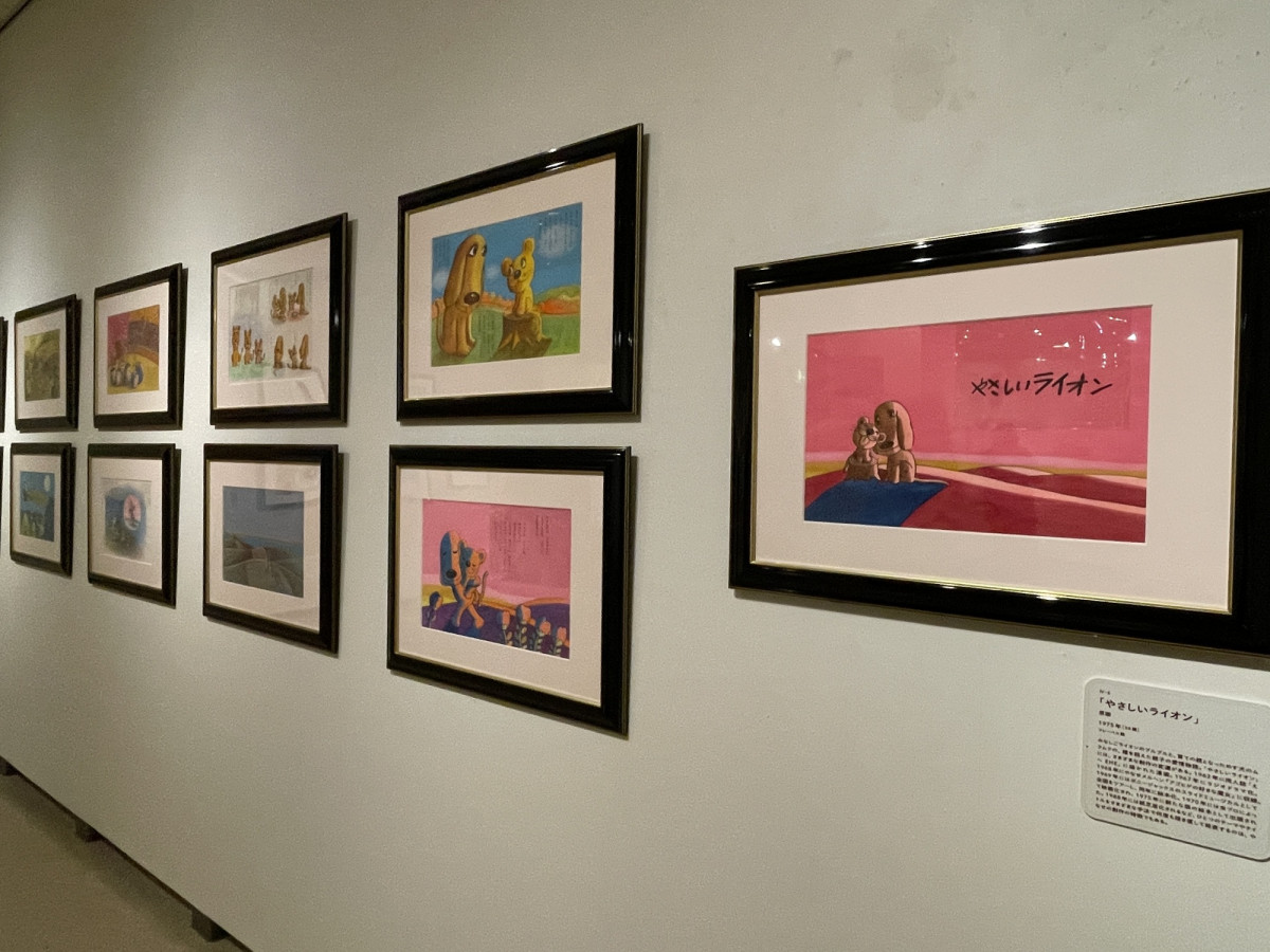 福岡県立美術館で開催中の展覧会「やなせたかし展 人生はよろこばせごっこ」の会場の様子。「やさしいライオン」ほか ©やなせたかし (公財)やなせたかし記念アンパンマンミュージアム振興財団蔵