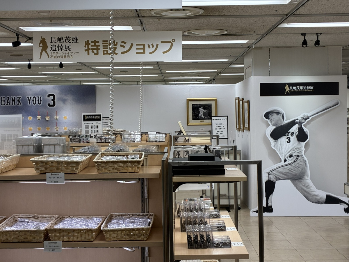 大丸福岡天神店で開催中の「長嶋茂雄追悼展 ミスタージャイアンツ 不滅の背番号『3』」のグッズ販売コーナー