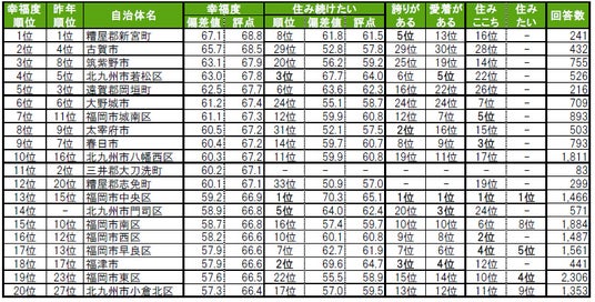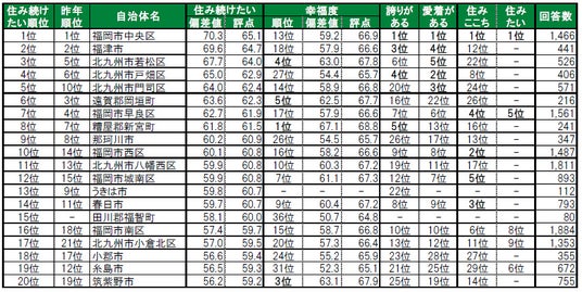 糟屋郡新宮町が、2年連続で1位に輝きました。2位は古賀市(昨年4位)、3位は筑紫野市(昨年8位)で、いずれも昨年から順位を上げてトップ3入りしています。その他トップ10内では、7位福岡市城南区(昨年11位)、10位北九州市八幡西区(昨年16位)が、昨年から順位を上げてトップ10入りしています。