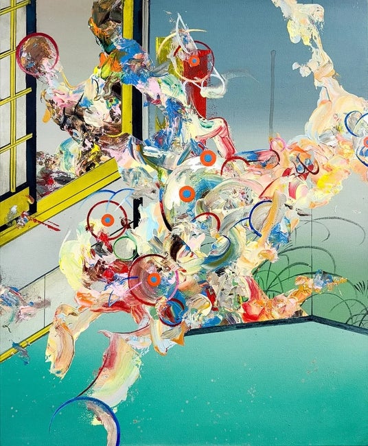 浮世絵の概念を探求してきた大河が、アブストラクトペインティングの手法を新たに取り入れ、独自のアプローチを展開。日本美術の系譜を感じさせつつ、グラフィカルな構成感と融合した独自の世界を描き出します。