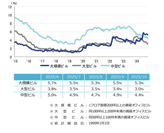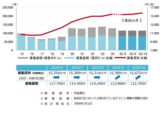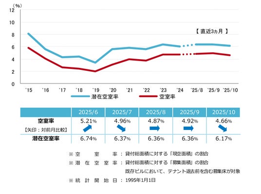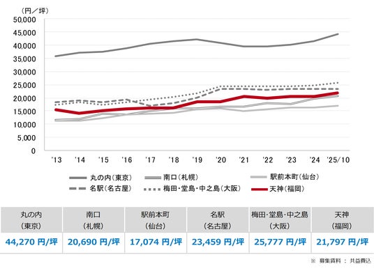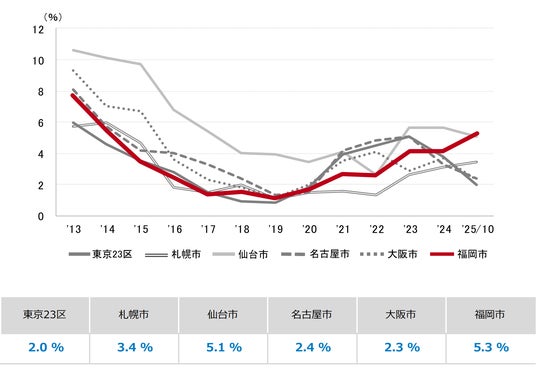 三幸エステート株式会社(本社:東京都中央区、取締役社長:福島正二郎)は、2025年10月度の福岡市オフィス賃貸状況(空室率&現空面積:全規模、募集賃料&募集面積:全規模、規模別空室率、主要エリア※1空室率:全規模)および全国6大都市(東京・札幌・仙台・名古屋・大阪・福岡)の大規模ビルのマーケットデータをまとめた「オフィスマーケット2025年11月号福岡」を公表します。