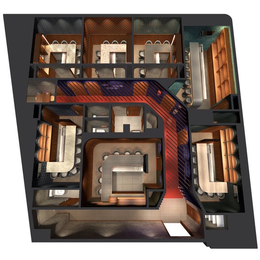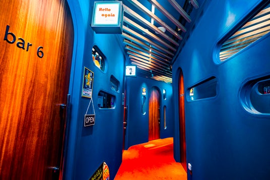 群青色の狭まるアーチ状のエントランスと曲がる通路は、まるで洞窟に入るような高揚感を生み、古き良き横丁の賑わいと神秘的な雰囲気を再現しています。統一されたミニマルデザインが、個性の違う7軒を“ひとつの街”のように繋げ、逆にこの狭さが人と人の距離を縮めています。