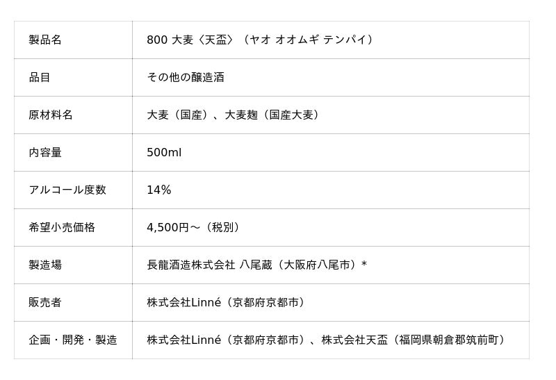 酒造りを起点に、世界の食文化を拡げることを目指す株式会社Linne(リンネ)【本社:京都府京都市、代表取締役:今井翔也、以下「LINNE」】は、福岡県の本格焼酎蔵・株式会社天盃(てんぱい)【本社:福岡県朝倉郡筑前町、代表取締役:多田格、以下「天盃」】とともに、麹の伝統技術を用いて醸した大麦100%の醸造酒《800 大麦〈天盃〉(ヤオ オオムギ テンパイ)》を発売いたします。