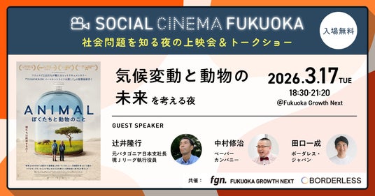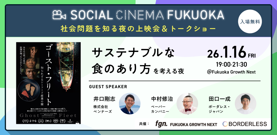 世界14カ国で50以上のソーシャルビジネスを展開する株式会社ボーダレス・ジャパン(本社:福岡県福岡市、代表取締役CEO:田口 一成、以下 ボーダレス・ジャパン)と福岡市の官民共働型スタートアップ支援施設「Fukuoka Growth Next」(所在地:福岡県福岡市、以下FGN)は、全2回にわたり社会問題をテーマにした映画上映会&トークショー「SOCIAL CINEMA FUKUOKA」を2026年1月16日(金)、3月17日(火)に開催することをお知らせします。