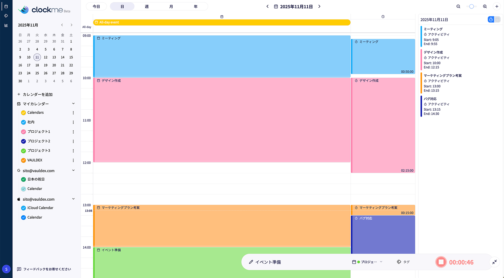 従来の数字ベースのタイムトラッキングとは異なり、カレンダーの中にリアルタイムで活動が記録されていく“カレンダービュー”を採用した新しい時間可視化ツールです。