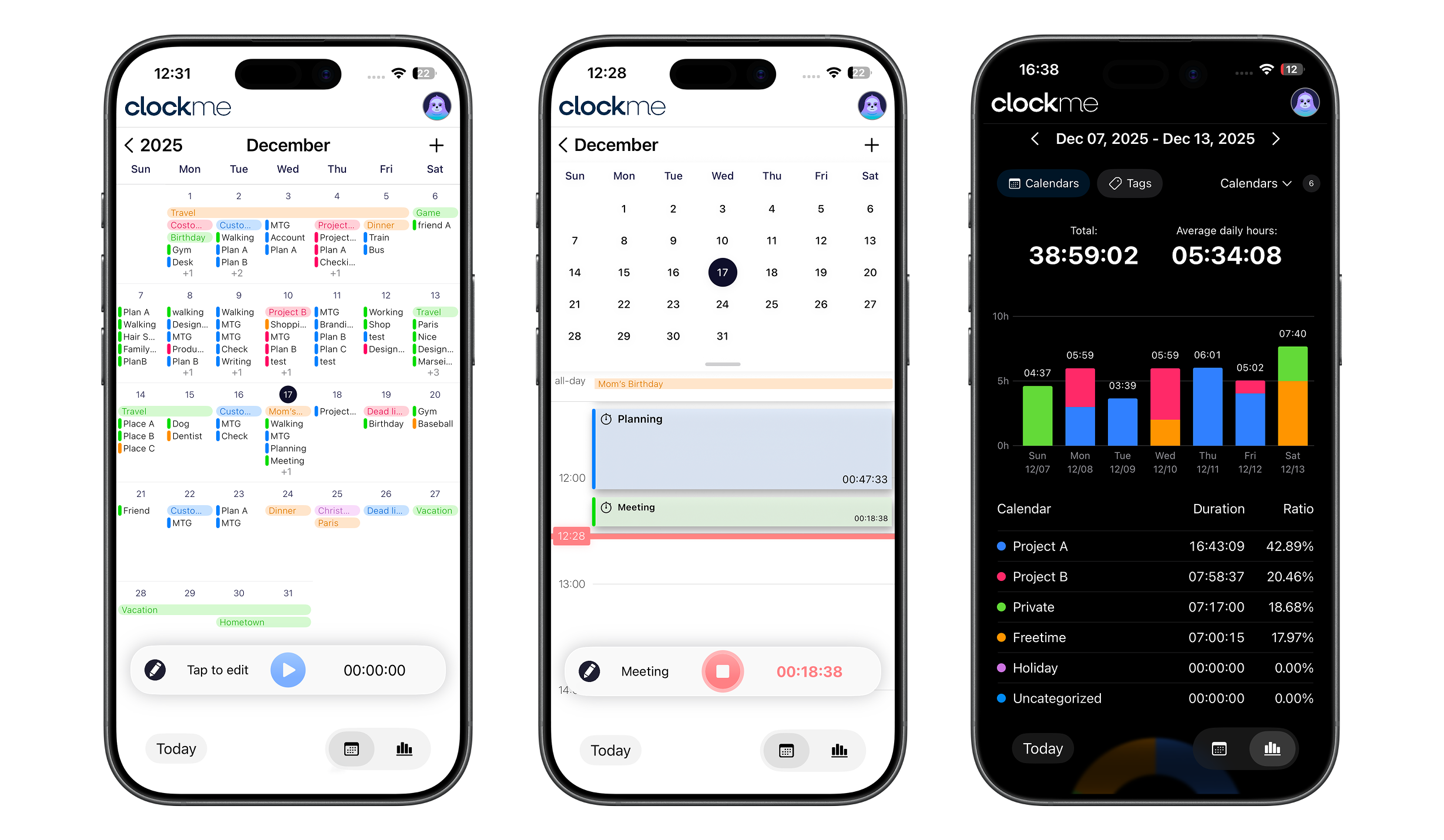 さらに、Clock Me は多くの人にとって馴染みのある「カレンダー」というツールにタイムトラッキングの概念を落とし込んでいるため、普段使っているカレンダーアプリと同じ感覚で操作することが可能です。