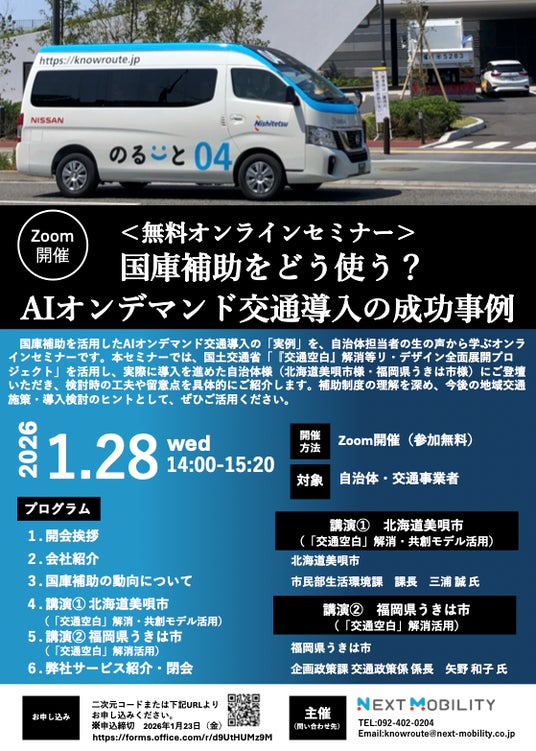 ネクスト・モビリティ株式会社(本社:福岡県福岡市、代表取締役:日高 悟)は、自治体および交通事業者の皆様を対象に、オンラインセミナー「国庫補助をどう使う?AIオンデマンド交通導入の成功事例」を、2026年1月28日(水)に開催します。