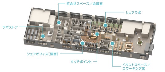 本施設は、革新的な先端モダリティ※3の研究を推進し、創業初期の資金調達から臨床開発までを一体的に支えるエコシステムを構築することで、グローバルで戦える創薬プレイヤーの輩出を目指しています。シェアラボ、コワーキングオフィス、シェアオフィス、会議室、イベントスペースなどを備えたインキュベーション施設として、エコシステム内の多様なプレイヤー間のオープンイノベーションを促進し、シード期からの手厚い支援を提供します。