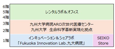 2~3階には「九州大学病院ARO次世代医療センター」および「九州大学生命科学革新実現化拠点」が入居します。4~6階は最小54平方メートル から最大1フロア1,175平方メートル まで専有可能なレンタルラボおよびオフィスとして整備しており、ライフサイエンス系企業の入居を見込んでいます。