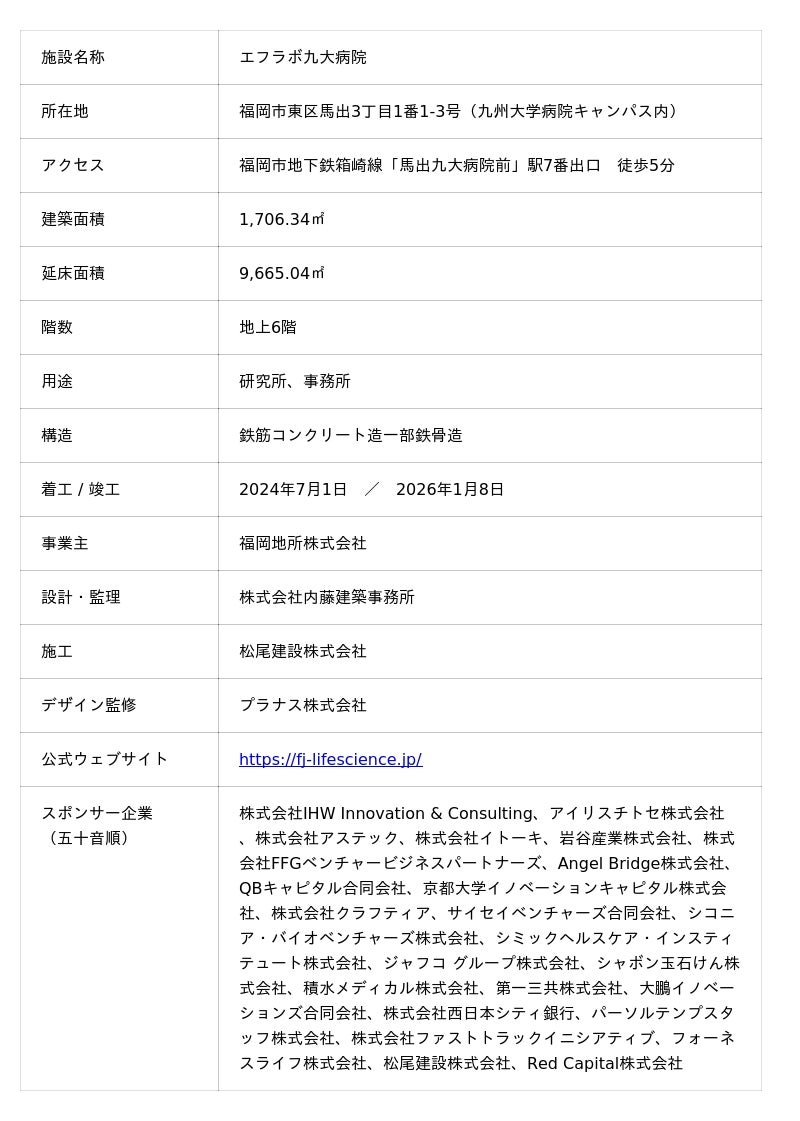 福岡地所株式会社(本社:福岡市博多区、代表取締役社長:榎本一郎、以下「当社」)が、福岡市東区馬出の国立大学法人九州大学病院(以下「九州大学病院」)敷地内で開発を進めてきた、当社初の賃貸型ウェットラボおよびライフサイエンス企業向け創業支援施設「エフラボ九大病院」(以下「本施設」)は、2026年1月26日(月)に開業セレモニーを実施し、正式に開業しましたのでお知らせします。国立大学病院キャンパス内に民間企業がレンタルラボを開設するのは、国内で初めての取り組みです。
