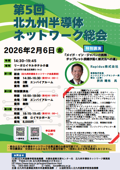 令和8年2月6日(金)に、第5回となる、北九州半導体ネットワーク総会・特別講演会・交流会の開催が決定しました。昨年の開催では、特別講演会に219名、交流会に175名と、半導体関連企業や大学関係者の方を中心に、大変多くの皆様にご参加いただきました。