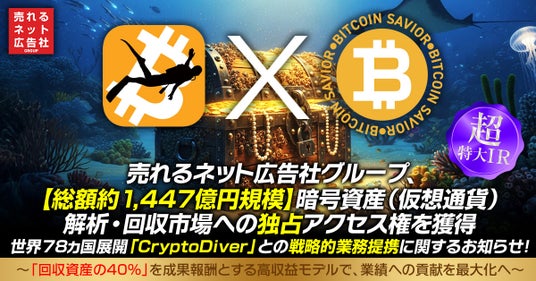 売れるネット広告社グループ株式会社(本社:福岡県福岡市、代表取締役社長CEO:植木原宗平、東証グロース市場:証券コード9235、以下「当社」)は、当社連結子会社である ビットコイン・セイヴァー株式会社(以下「Bitcoin Savior」)が、世界規模で暗号資産(仮想通貨)関連サービスを展開する合同会社CryptoDiver運営事務局と戦略的業務提携契約を締結し、約1,447億円規模と推計されるCryptoDiverの暗号資産回収・解析案件の独占的な紹介連携を開始したことをお知らせいたします。