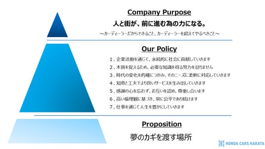 弊社は「人と街が、前に進むための力になる。」というパーパス(企業理念)を掲げており、弊社の商圏においてHonda製品を通じ存在を期待されるような地域共生型ディーラーを目指しています。