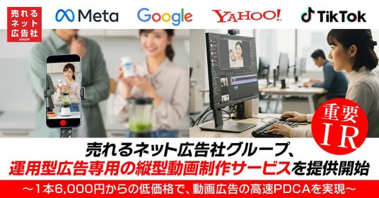 売れるネット広告社グループ株式会社(本社:福岡県福岡市、代表取締役社長 CEO:植木原宗平、東証グロース市場:証券コード9235、以下 売れるネット広告社グループ)は、グループの中核事業会社である売れるネット広告社株式会社において、D2C・通販企業向けに「運用型広告専用の縦型動画制作サービス」を、1本6,000円から提供開始したことをお知らせいたします。