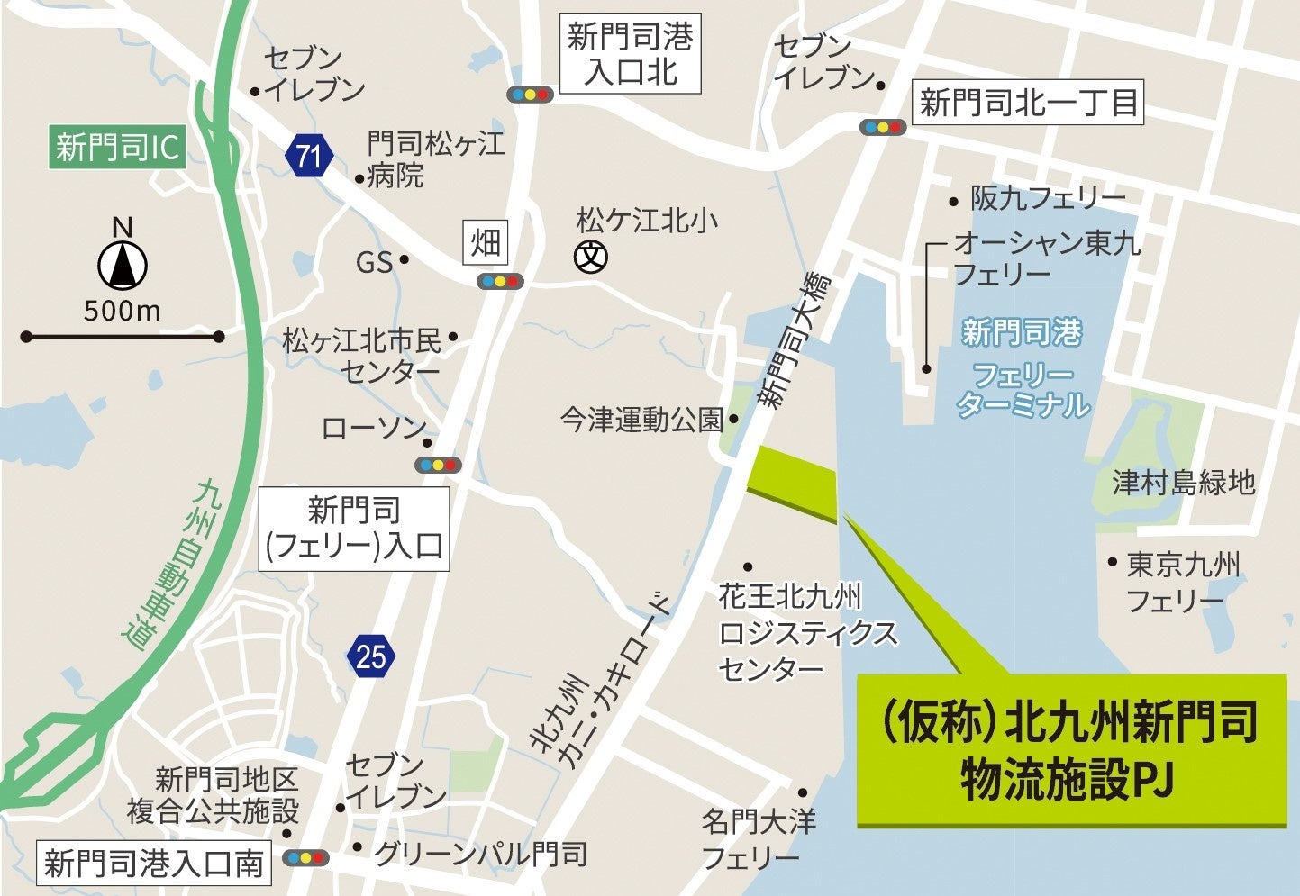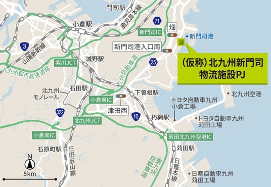 (仮称)北九州新門司物流施設PJは、九州自動車道「新門司」ICから約3.5km、「門司」ICから約6.1kmに位置し、九州圏の一大消費地の一つである小倉駅周辺まで約30分(約14km)で配送することが可能な都市中心部近接型の物流施設です。また、国内第4位、九州最多の海上出入貨物量※1を誇る北九州港内、新門司フェリーターミナルに隣接し、港湾機能を生かした輸送対応や貨物の保管ニーズへも対応するほか、北九州空港へのアクセスも良好で、陸・海・空の三位一体の物流ネットワークを活用できる点が大きな特徴です。北九州市が本州と九州の結節点に位置することから九州全域への広域配送拠点および本州と九州全域をつなぐ配送拠点としての運用が可能であり、配送時間の短縮によって2024年問題に伴う長距離ドライバー不足の解消も期待されます。さらに、トラックごと輸送可能なRORO船※2やフェリーでの長距離輸送ニーズが高まっていることを踏まえ、港へのアクセス性を生かしたモーダルシフトの促進にも貢献します。