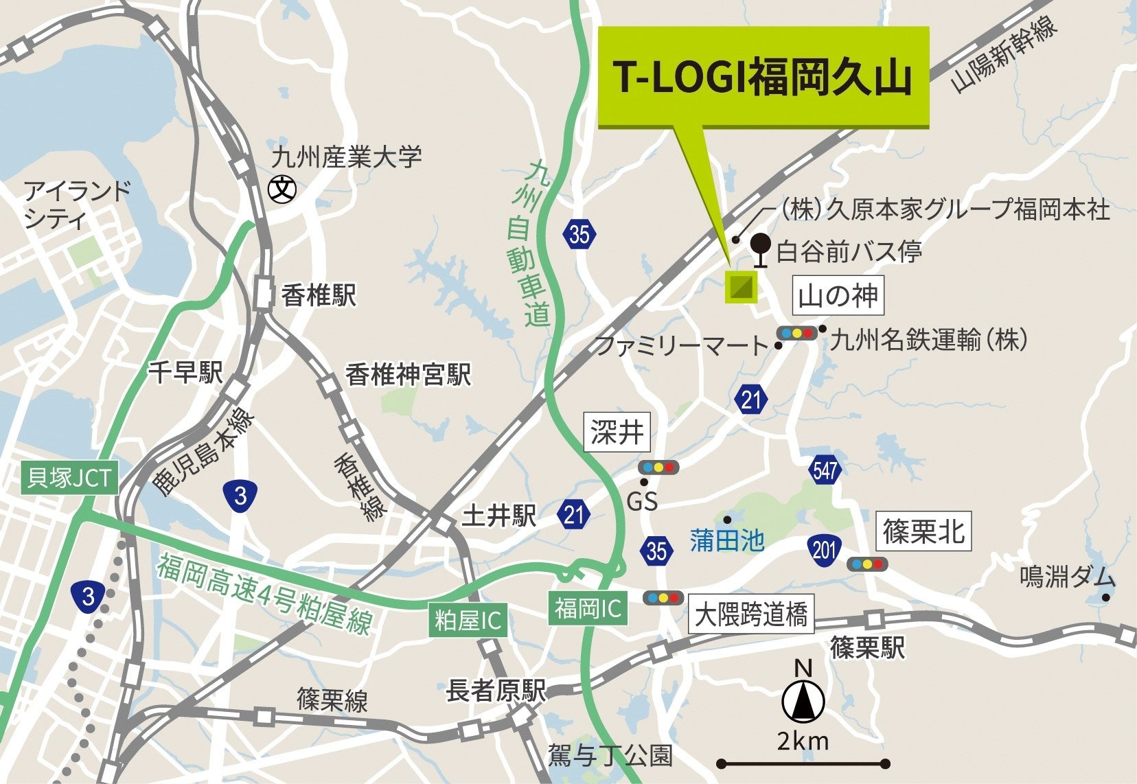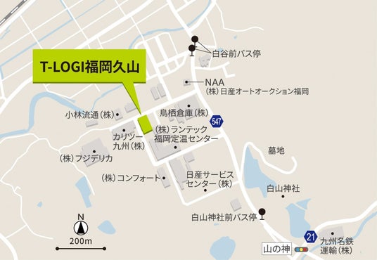 T-LOGI福岡久山は九州の大動脈である九州自動車道「福岡」ICから約6.0kmの場所に位置し、九州圏の一大消費地である福岡市博多駅周辺まで約35分で配送することができる、都市中心部近接型の物流施設です。また、「福岡」ICまで車で約10分のアクセスを生かし、福岡市内への配送のみならず九州全域への配送拠点、さらには本州と九州全域をつなぐ広域配送拠点にも適した立地であり、配送時間の短縮によって2024年問題に伴う長距離ドライバー不足の解消も期待されます。