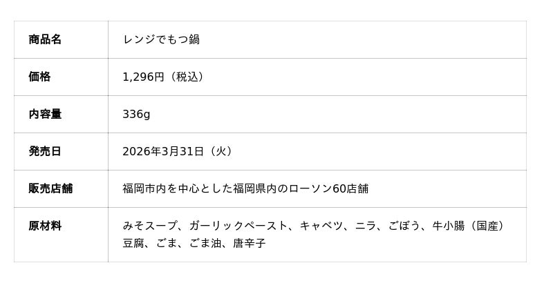 博多もつ鍋の名店「もつ鍋おおやま」(運営:株式会社ラブ、本社:福岡県福岡市)は、ご家庭の電子レンジで温めるだけで本格的な博多もつ鍋が楽しめる新商品「レンジでもつ鍋」を、2026年3月31日(火)より福岡市内を中心とした福岡県内の60店舗にて販売開始いたします。
