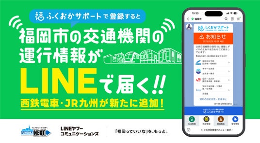 LINEヤフーコミュニケーションズ株式会社(本社:福岡市博多区、以下当社)は福岡市との共働により、福岡市が提供する福岡市公式ポータルサイト「ふくおかサポート」と連携し、福岡市LINE公式アカウントにおいて公共交通機関の運行情報配信機能を拡充します。