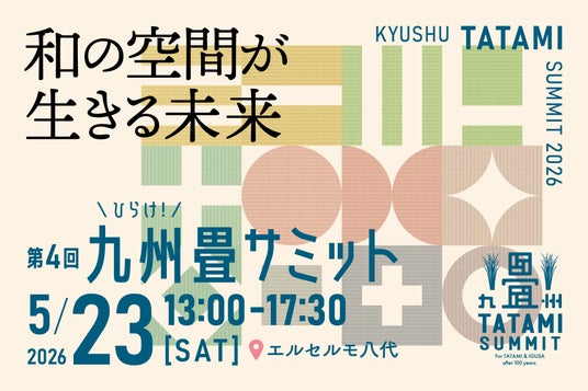 九州畳サミット実行委員会(実行委員長:株式会社イケヒコ・コーポレーション 代表取締役 猪口耕成)は、2026年5月23日(土)に「第4回 九州畳サミット」を、い草の一大産地である熊本県八代市にて開催いたします。ライフスタイルの変化などによりい草の作付面積がこの30年でピーク時の約1/30以下にまで減少する中、今、産地と暮らしをどうつなぎ直すかが問われています。畳やい草は、くつろぎや家族の時間を支えてきた日本の暮らしの原風景ともいえる存在です。本サミットでは、い草生産者や畳店、建築、行政、文化関係者など多様な立場の関係者が集い、その価値とこれからの可能性を見つめ直すとともに、一般生活者にも開かれた場として、講演やワークショップ、体験型マルシェを通じて和の空間の未来を発信します。