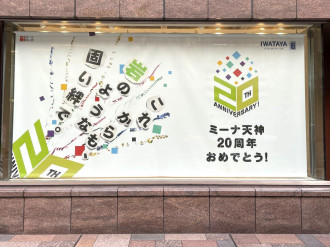 天神地区の12の商業施設が現在、10月29日で創業20周年を迎えた商業施設「ミーナ天神」(福岡市中央区天神4)に向けたお祝いエールを一斉掲出している。